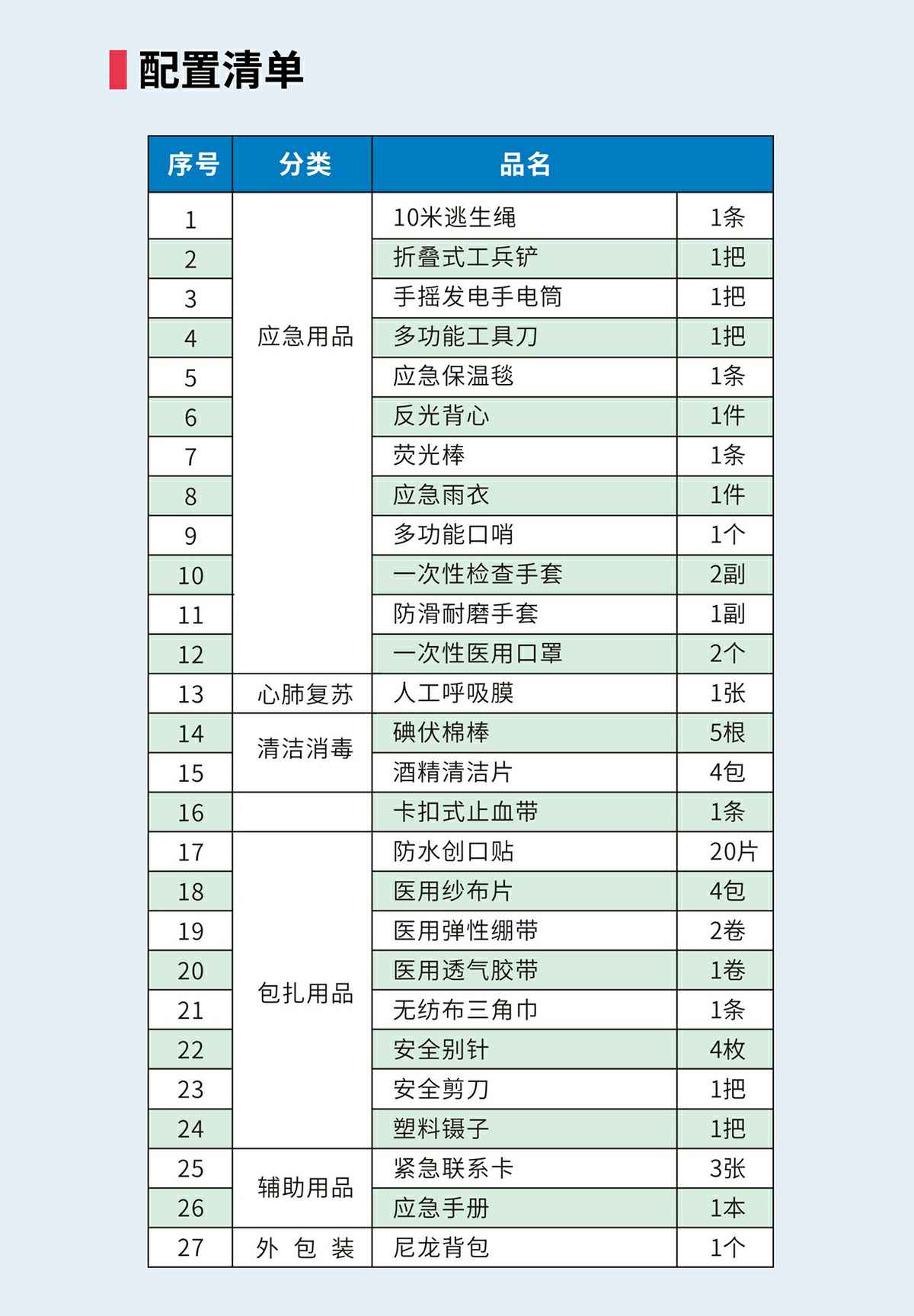 雷火app官网登录入口-雷火(中国)防灾应急包,适合突发灾害事故时恶劣环境下使用,配置全面、科学,满足从日常保健到灾难自救逃生的全面需求。